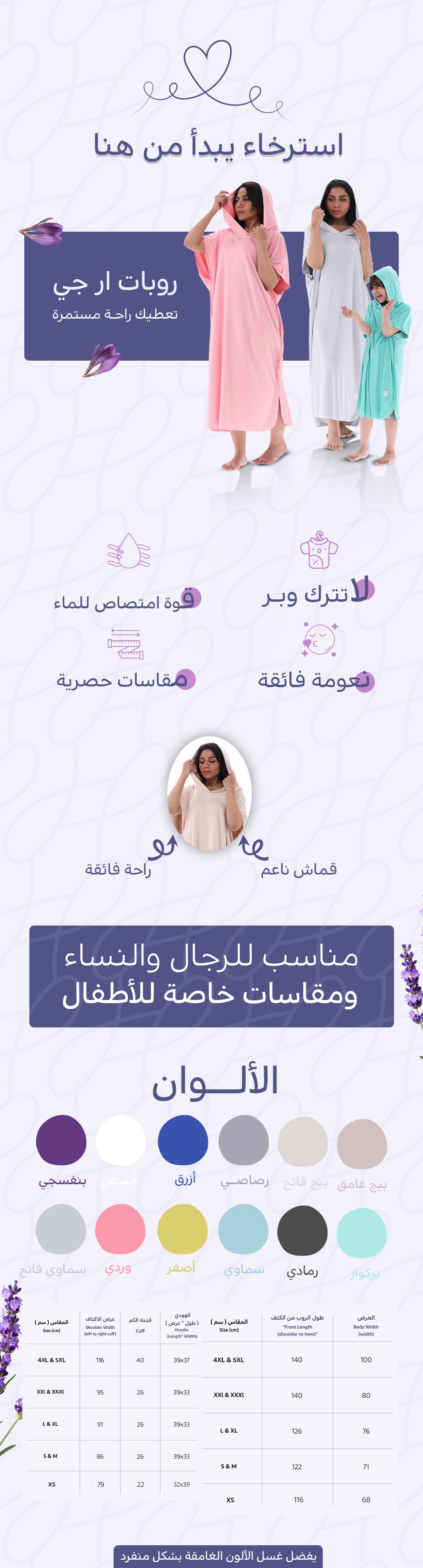 - تصميم الروب : روب ناعم واسع مع غطاء رأس